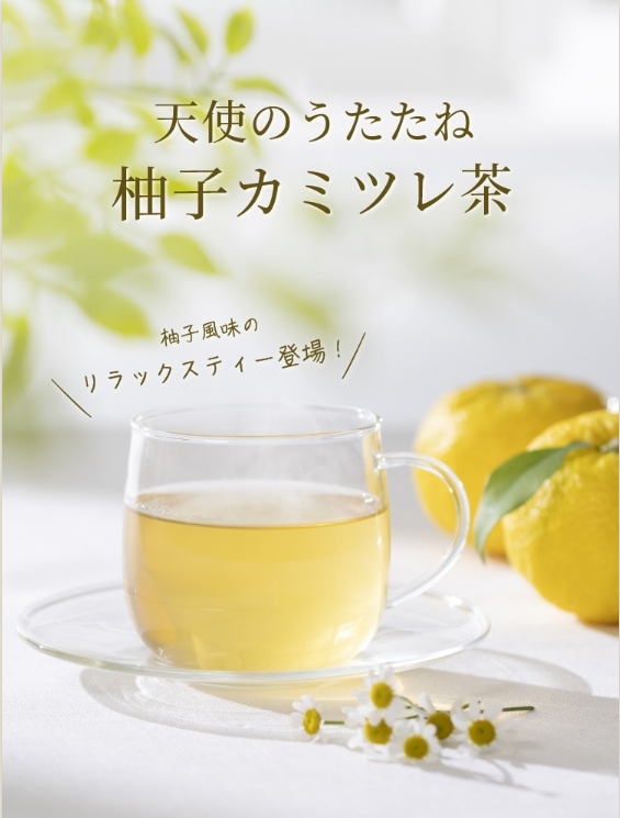 ひと口飲むたびに、ココロほぐれる柚子の香りとやさしい甘みで、おもわず天使もうたたねしてしまいそうなリラックスハーブティー。