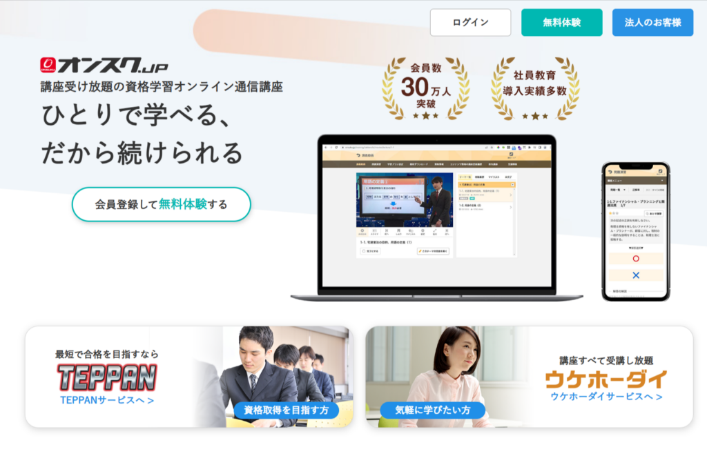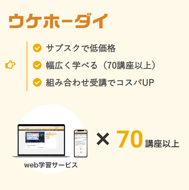 【PR】オンスク.JP 今回ご紹介するのはいつでもどこでも勉強できるオンラインの資格学習サービスです♪ 【月額1,628円】資格が学び放題!「資格を取りたいけど、スクールは高い…」「スキマ時間で効率よく勉強したい」そんな方におすすめなのが、月額1,628円で資格講座が受け放題のオンライン資格学習サービスです。こちらの学習サービスの最大の魅力は月額 1628円で60講座以上の資格学習コンテンツが利用可能なこと!一般的な資格スクールよりも圧倒的に低コストで始められるのが強みです♪ スマホ・PC対応でどこでも学習!通勤時間や、ちょっとした休憩時間、寝る前の30分などオンラインだから場所を選びません。 資格の学校TACのノウハウが凝縮された充実の講義ムービー過去問を徹底分析した問題演習機能1動画5分から視聴でき、ちょっとしたスキマ時間に学習できるのも嬉しい♪問題演習は一問一答形式なのでこちらもスキマ時間にさくっとできちゃいます!初めてのオンライン学習でも何をやればいいか分からない...を解消してくれます♪ 【資格講座ラインナップ】(抜粋)「法律・会計」 行政書士、社会保険労務士、ビジネス実務法務検定2級、ビジネス実務法務検定3級 日商簿記3級、知的財産管理技能検定3級、誰でも簡単!財務諸表の読み方「ビジネススキル」秘書検定2級 3級、サービス接遇検定 準1級 2級、衛生管理者 危険物乙4、気象予報士、誰でも簡単!ビジネス統計学「IT」ITパスポート、情報セキュリティマネジメント、 誰でも簡単!ネットワーク入門、誰でも簡単!Webページ制作 JavaScript入門 誰でも簡単!Webページ制作 HTML&CSS入門他にも、宅地建物取引士や中国語、ビジネス英語だったり、登録販売者、色彩検定2級などジャンルが幅広いのが強みです! ・就職・転職のために資格を取りたい・スキマ時間を有効活用したい・まずは低コストで始めたい・いろんな資格に挑戦してみたいこんな方におすすめです♪ 「資格を取りたい」と思った時がチャンス!高額スクールに申し込む前に、まずは低コストで試してみませんか?気になった方は詳細はこちらから、または下記バナーをクリック♪ 詳細はこちらをクリック おすすめサービス ウケホーダイ 手軽に学びたい方におすすめ♪ウケホーダイで学べる講座は70講座以上!「何か資格を取りたい」「何か学んでみたい」「ビジネススキルを上げたい」など、さまざまなレベルアップを目指して、いいとこ取りで学びをスタートしたい方におすすめ。どの講座も追加料金なしで使えるので、興味を持てる講座をとことん探して学べます。 TEPPAN 最短で合格を目指したいなら、書籍+webでトータル学習ができるTEPPANがおすすめ♪試験頻出テーマに絞った練習問題、過去問題+解説付きで短期間で効率的に合格を目指せます。 ご提供プラン 商材名 オンスク.JP運営者 T.A※当サイトはアフィリエイトプログラムを利用し宣伝目的で作成しております。