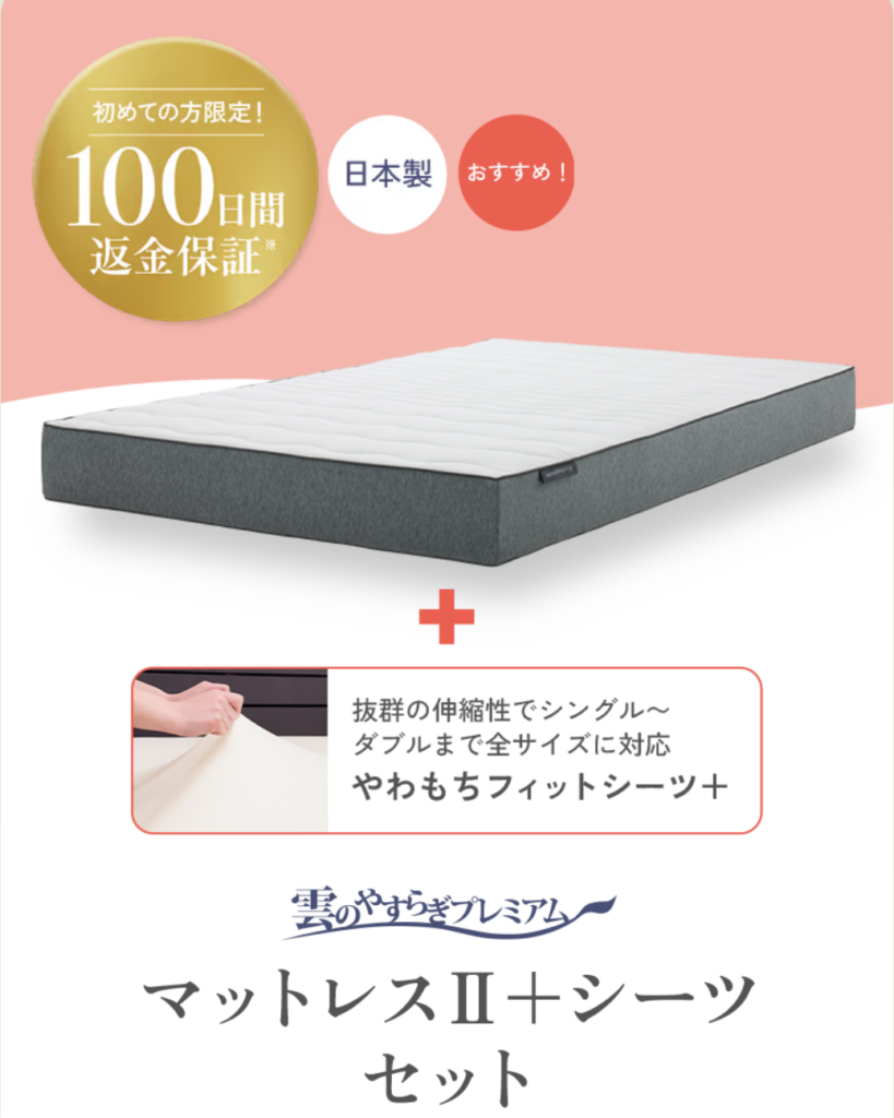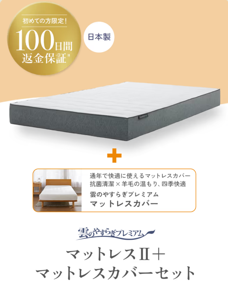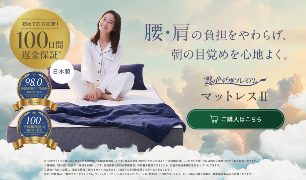 【PR】雲のやすらぎプレミアム 今回はマットレスのご紹介です♪ 「朝起きると腰が痛い…」「マットレスが合っていない気がする…」 そんな悩みを抱えている方におすすめしたいのがこちら♪ 従来モデルからさらに進化し、“まるで雲の上に寝ているような寝心地”を追求した話題のマットレスです♪ ★低反発ウレタン層を導入・体にやさしくフィット・柔らかく包み込むような雲の上の寝心地を実現 ★腰を徹底サポートする3D構造・2種類の高反発ウレタン・高弾性ウレタンを掛け合わせ、腰をしっかり支えます。さらに、頭・腰・脚部分の部位ごとに3Dカットされたブロック層の幅を変化させているので仰向け寝・横向き寝どちらにも対応した作りになっています♪ ★5層構造でどんな体型にもフィットマットレスは5層構造になっており、・最下層を最も硬くし、上層にいくほど柔らかく設計これによりあらゆる体格の方でもバランスよく身体をしっかり支えてくれます♪ ★縫い目の幅を変えることでさらに体圧を分散・腰 → 細かい縫い目でしっかり支える・頭・脚 → 縫い目幅を広くし、優しく支えることで、体圧を分散。 ★通気性が高く一年中快適マットレス全体の通気性をよくするため、上から下方向に向けて全てのウレタン層に一気通貫の通気孔を設置そのため季節を問わず使えるのもポイントです♪ ・自分に合うマットレスが見つからず、朝起きると腰が痛い・寝具の買い替えで、評判のいいマットレスを探しているそんなお悩みをお持ちの方におすすめしたいマットレスです。 腰痛にお悩みの方は一度試してみる価値ありです♪100日間の返金保証があるのも嬉しいですね。 気になった方は詳細はこちらから、または下記バナーをクリック♪ 詳細はこちらをクリック おすすめ商品 マットレスⅡ シングル59,800円(税込) 身体に負担をかけさせない設計と、眠りの時間を快適に保つ設計♪ マットレスⅡ+シーツセット シングル65,200円(税込) セット価格2000円OFF♪送料無料とろけるような寝心地のやわもちフィットシーツとセットもおすすめです。 マットレスⅡ+マットレスカバーセット シングル68,800円(税込) セット価格3000円OFF♪送料無料柔らかな触感と優れた通気性を備えた専用側地との特別セットです。 おすすめ情報 商材名 雲のやすらぎプレミアム運営者 T.A※当サイトはアフィリエイトプログラムを利用し宣伝目的で作成しております。